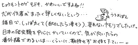 [102] 楽しく読ませて頂いています! キャラクターひとりひとりがうまくできていて、絵も温かく可愛らしいです! これからも楽しみにしています! ちなみに我が家にはヒョウモントカゲモドキがいるのでテーマのひとつとして取り上げて頂けたら嬉しいですw <2015/10/04 10:30:49> W/YnnbQ/P