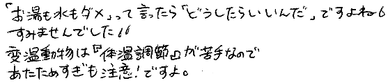 [210] ぬるいお湯は結構いいと思うの <2016/02/22 00:30:14> rOl6eJP0P [209] 爬虫類は水以上にお湯がダメなのか…変温動物は冷たい方がダメかと思ったけど意外だわ勉強になる <2016/02/21 23:57:48> B4TbgM0.S