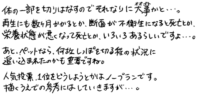 [413] トカゲのしっぽ切りって結構軽く考えてたけど、「してしまった」って言うくらいには重いものだったんだな。 ところで人気投票、教師陣が入ってないって事は一位になった人が生徒会長にでもなる……のか……? <2016/07/13 23:50:25> D/GisOk1P