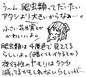 [492] そうか、リオさんは可愛いものが好きか……でも猫が苦手って事だからな……いや待て、そもそもニホンヤモリ視点の可愛いものってなんだ!? やっぱり爬虫類系がいいのか……? <2016/08/07 01:37:06> 5E3uMpG.P
