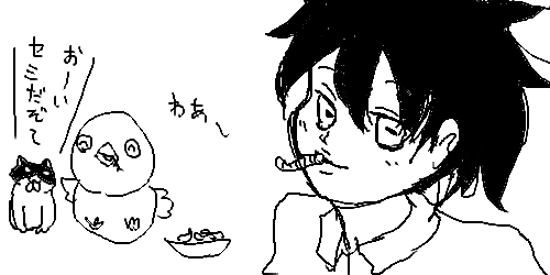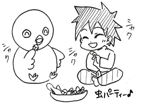 お礼によたかんとジュンが虫パーティーをする絵を描いたところ、またいただいてしまい‥‥! クロベエさん(猫)に虫をいただいてます。食べてるのミミズなのに、何かセクシー! ノウノ先生の『よだかの星』